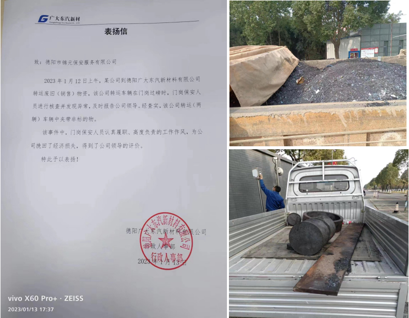 1月12日上午,我公司駐廣大東汽保安班當(dāng)班隊員查獲非法夾帶物資兩車,為客戶挽回了一定的經(jīng)濟(jì)損失,我公司保安員認(rèn)真履職、高度負(fù)責(zé)的工作態(tài)度得到了甲方領(lǐng)導(dǎo)的高度評價。